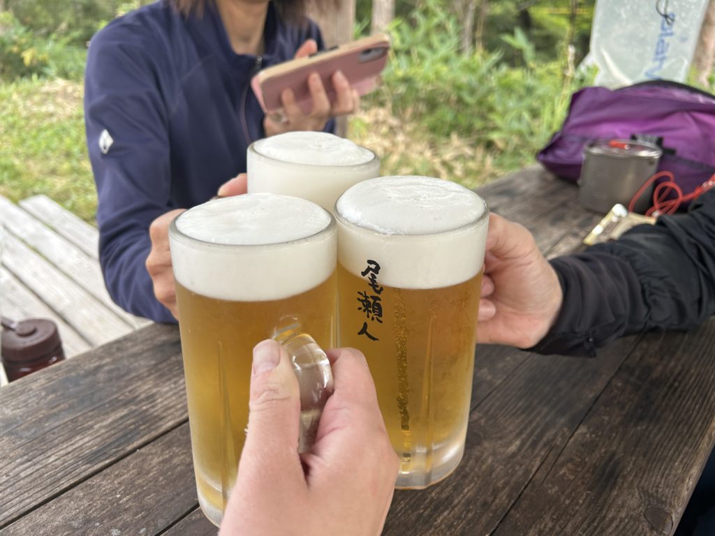 尾瀬沼ヒュッテ、冷えたジョッキに生ビール。最高です。一口目のこのために生まれてきた感、一体なんなんでしょうか。