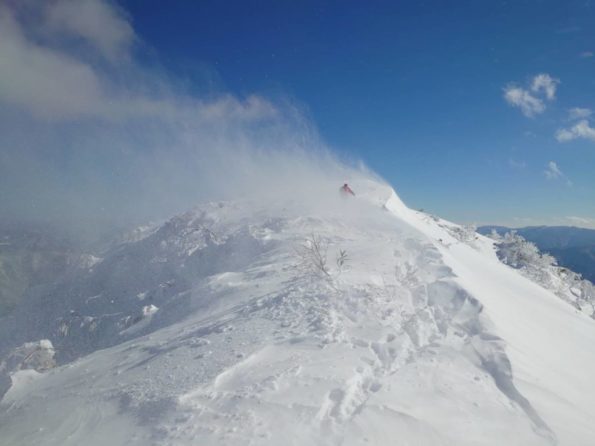 お天気は快晴~晴、トレースがしっかり付いておりラッセルは、なし。(先行された神の皆様、ありがとうございます!)シャクナゲ平までは美しい樹氷ゾーンを楽しみ、白山、別山が素晴らしい!と感激していると、シャクナゲ平より上で爆風。酔っ払いみたいにフラフラしました。(風がなくてもフラつく近ごろ…) そして、いつ来るのかと恐れていた「もちが壁」。「すでに終わってるよ」というリーダーのお言葉が、新年一の吉報でした。そして中荒島岳から向かう先に真っ白い雪煙が…